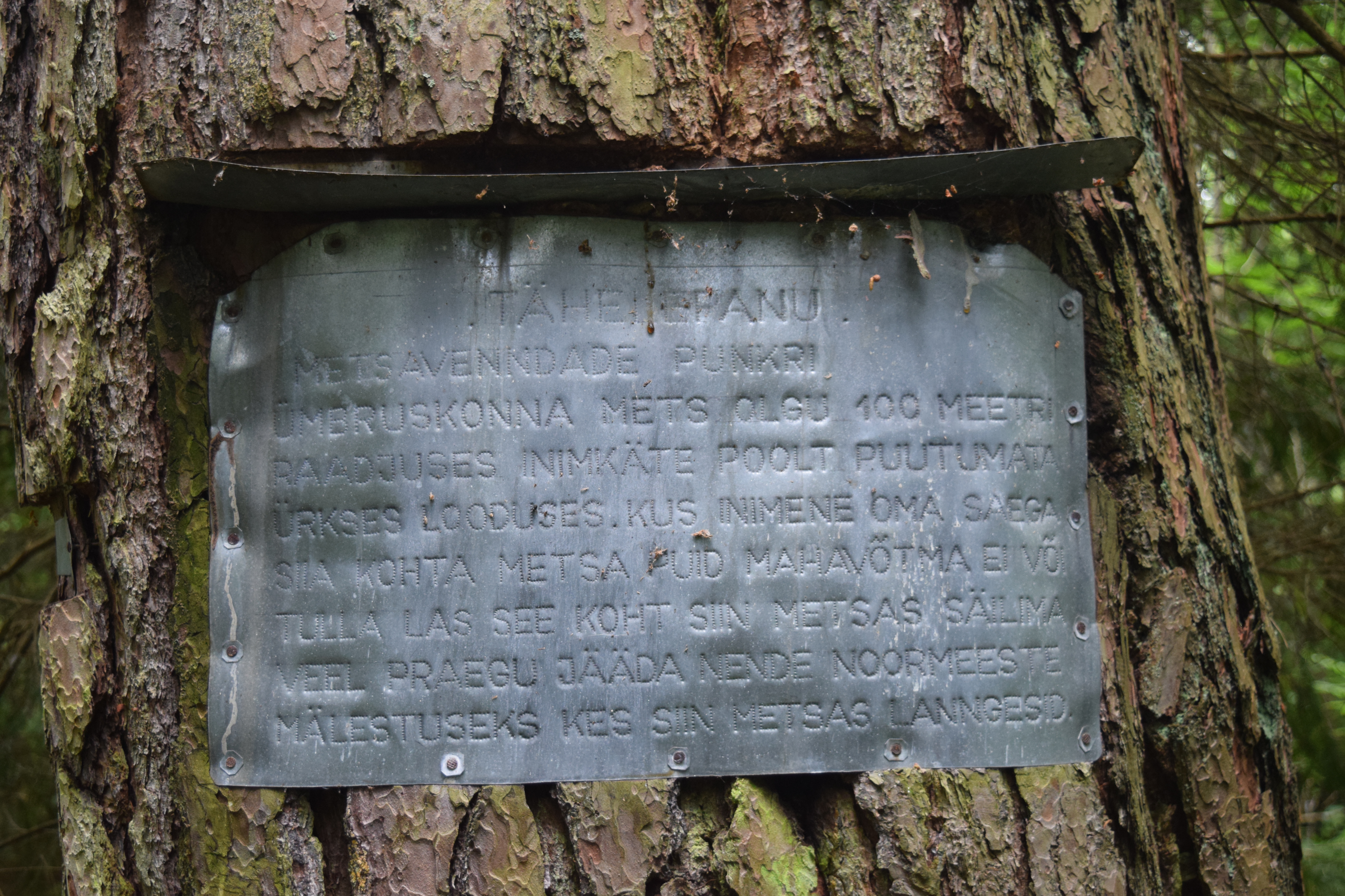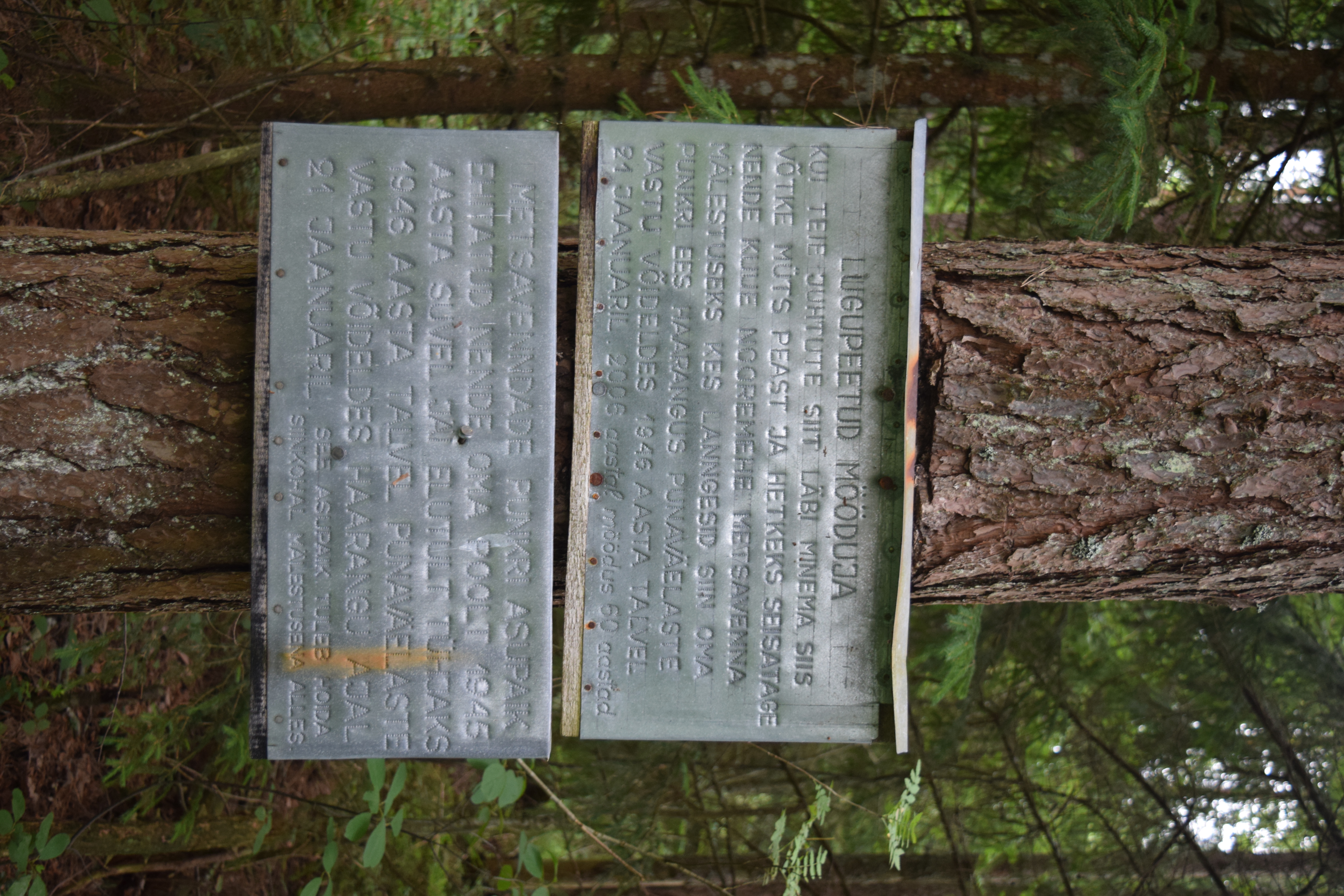 KUI TEIE JUHTUTE SIIT LÄBI MINEMA SIIS VÕTKE MÜTS PEAST JA HETKETS SEISATAGE NENDE KUUE NOOREMEHE METSAVENNA MÄLESTUSEKS KES LANNGESID SIIN OMA PUNKRI EES HAARANGUS PUNAVÄELASTE VASTU VÕIDELDES 1946 AASTA TALVEL 21 JAANUARIL 2006 aastal möödus 60 aastad.