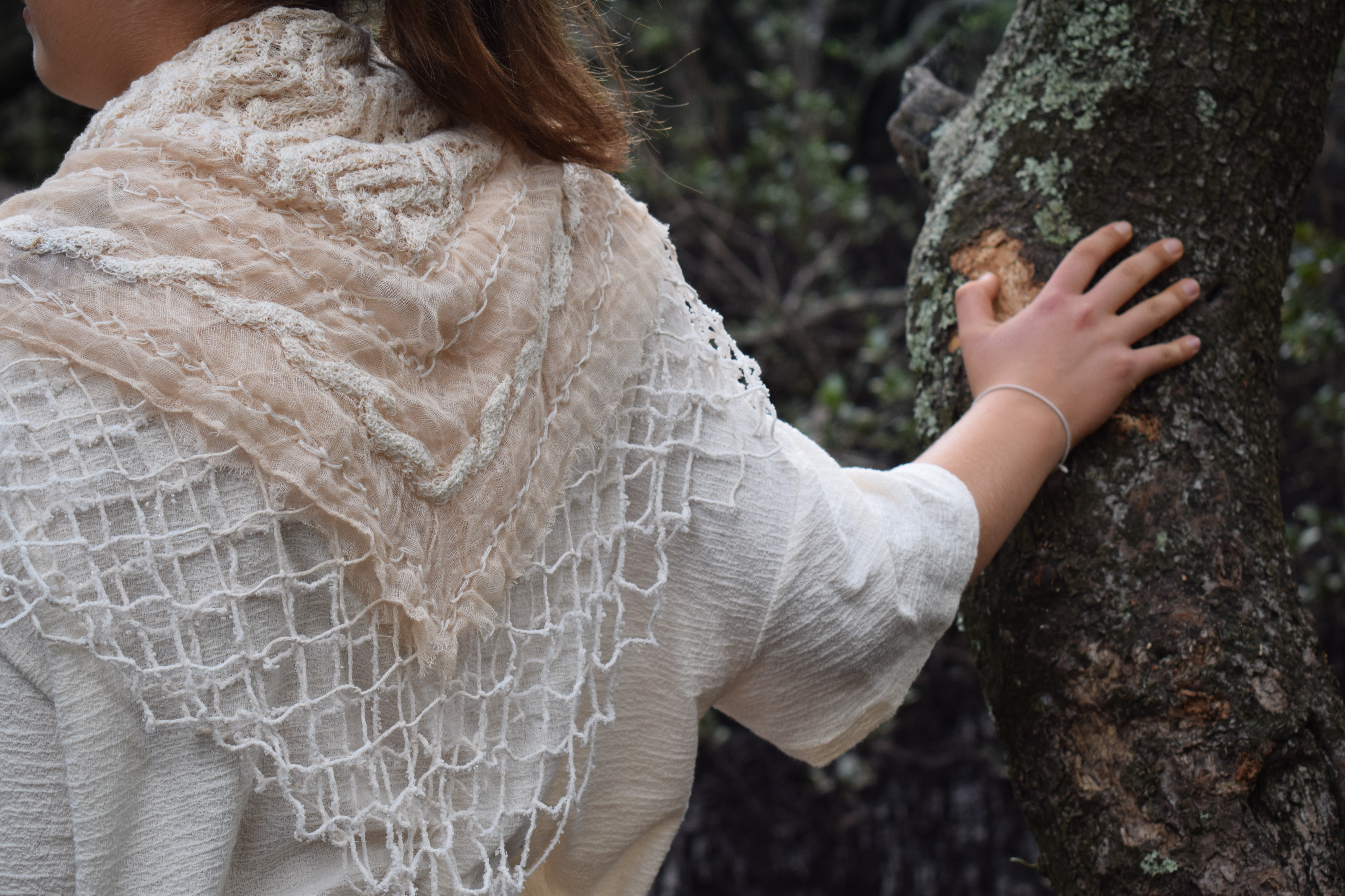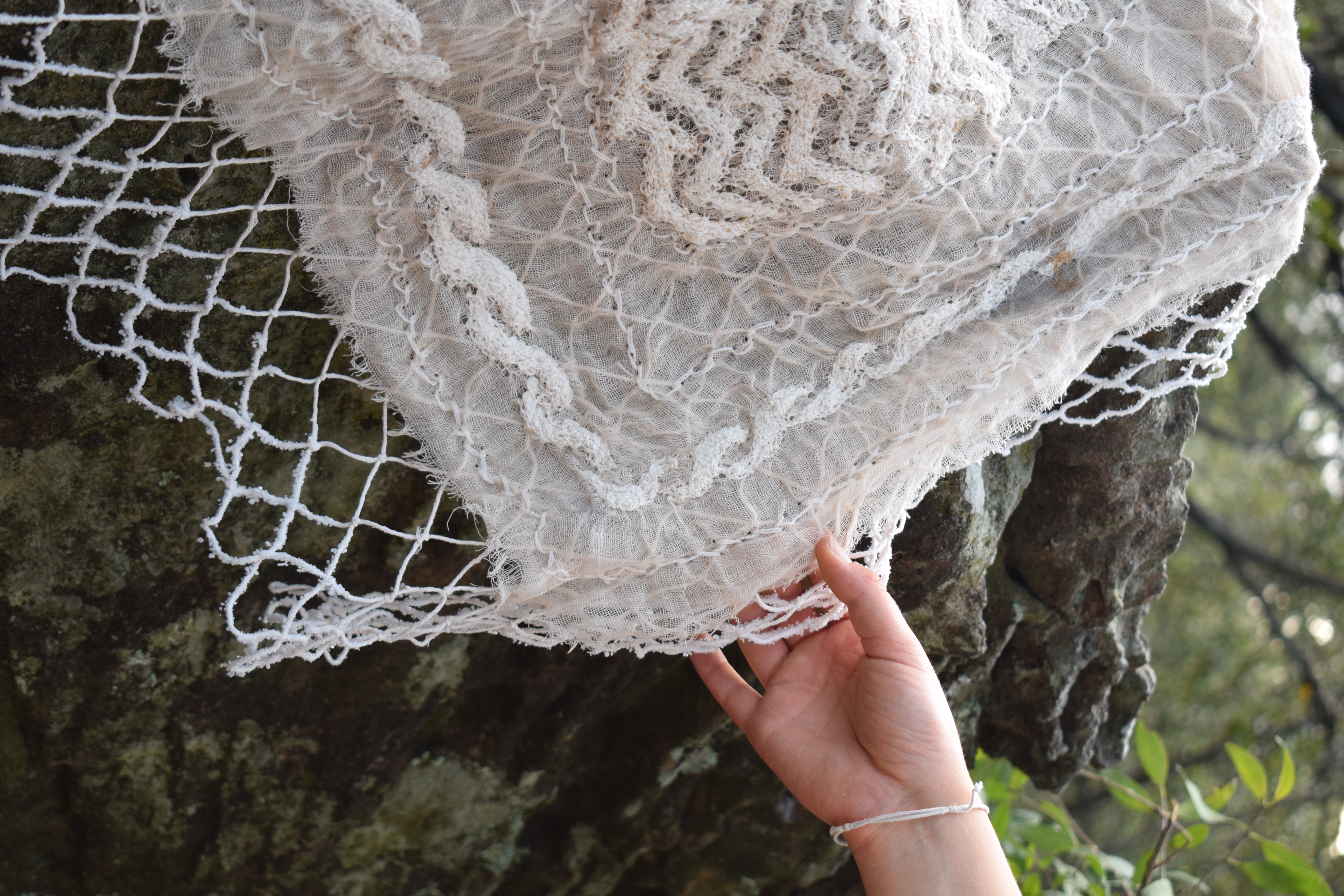 Created with both family and community in mind, the work embodies a lot of personal time into it, aided by the fact my grandmother and mum both assisted in its creation. The story behind the shawl is based on convergent histories of maritime trade and the knitted lace tradition across Scotland, Iceland, Orenburg and Estonia. During my research I found relationships between the properties of lace and water - Haapsalu mud and archeological lace found on the Gunnister Man; seaside shepherds in Saaremaa; Kihnu trois and Cornish ganseys worn by sailors; and folklore surrounding lace and mermaids/näkkid. This work is an ode to all of these relationships and connections that are held in the fibres of an object.
